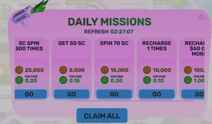 For ongoing promotions on the casino, simply click on the “Rewards” button at the top of your screen to see what is available and claim it. Here, you’ll find daily missions that can get you more than 1 SC per day.