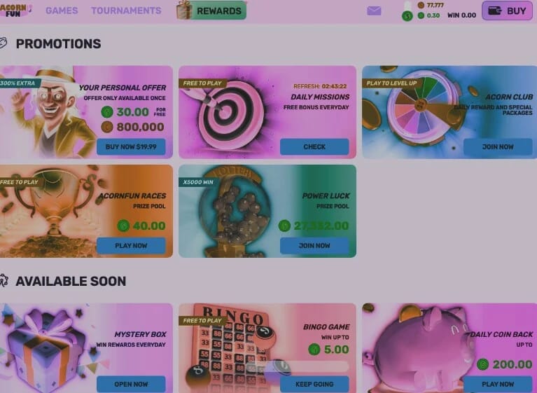 Overall, Acorn Fun has allowed players to enjoy sweepstakes games without necessarily purchasing Gold Coin bundles. With the numerous bonuses, such as daily rewards, referral bonuses, tournaments, and giveaways, you’re sure to enjoy an exciting gaming experience.