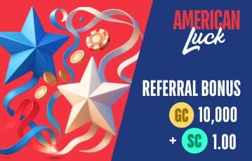 Use the link on your page to get your friends to join the site, and you'll get a reward. For each successful American Luck referral, you'll get 10,000 GC and 1 SC. That's for every friend who creates an account — you don't need them to make an optional GC purchase for you to get this bonus. However, you're limited to claiming this bonus only 10 times. Which I think is fair.
